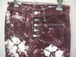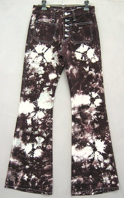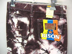 BISON 絞り染めベルボトム MODEL:1260 COLOR:438 SIZE:27インチのみ QUALITY:綿100% PRICE:税込)¥5.985(実質¥171値引) くすんだエンジ色ベースの 絞り染めのベルボトムです。 シルエットがキレイと定評がある BISON-1260がベースとなっています。 通常カラーのBISON-1260と比較して 染めの関係でやや小さめの作りとなっています。 大きさは染め上がりによる個体差がありますので ご注文前に実寸の確認をする事をオススメします。