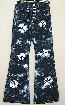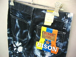 BISON 絞り染めベルボトム MODEL:1260 COLOR:479(ネイビー系色) SIZE:27・28インチのみ QUALITY:綿100% PRICE:税込)¥5.985(実質¥171値引) くすんだネイビーがベースの 絞り染めのベルボトムです。 シルエットがキレイと定評がある BISON-1260がベースとなっています。 通常カラーのBISON-1260と比較して 染めの関係でやや小さめの作りとなっています。 大きさは染め上がりによる個体差がありますので ご注文前に実寸の確認をする事をオススメします。