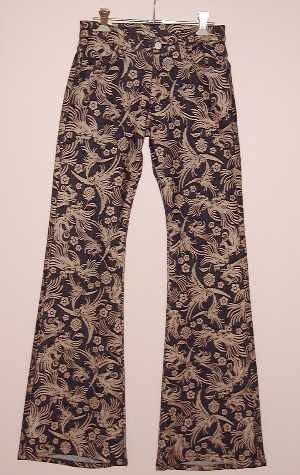 BISON ストレッチベルボトム MODEL:1625 COLOR:906(ベージュ) SIZE:27インチのみ QUALITY:綿95%・ポリウレタン5% PRICE:税込)\9345 本体)\8900 ・ストレッチのベルボトム全体に 鳳凰の柄が入っています。 ・フロントはジッパータイプです。 ・ストレッチなのでピッタリ穿いても動きやすいです。 ご注文前に必ず在庫の確認をして下さい。
