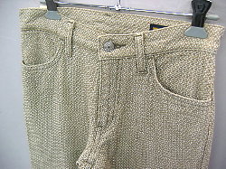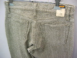 BISON ドビ-織りベルボトム MODEL:1630 COLOR:51(グリーン系) SIZE:28インチのみ QUALITY:綿100% PRICE:\2900 ニットのようなジャガード織りのベルボトムです。 生地全体やわらかく とても穿きやすい一本です。 *実寸はお問い合わせ下さい。 フロントはジッパーフライです。
