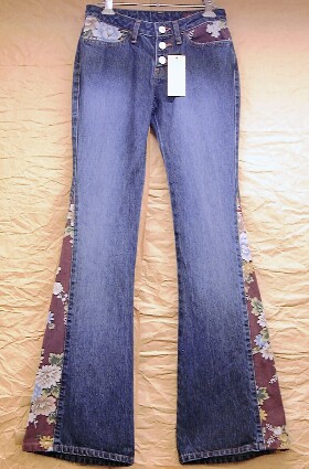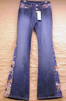裾サイドとポケットに綿の生地を貼り合わせ裾幅を広くしたべルボトム、花柄のプリントがさわやかでかわいい感じのベルボ。
