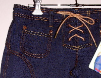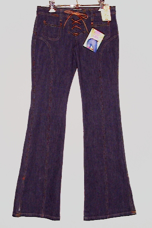 デザインベルボトムです。ブーツカットより少しだけ広がりがあります。ウエストが紐でしばるタイプで、前にもステッチが入っています。