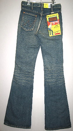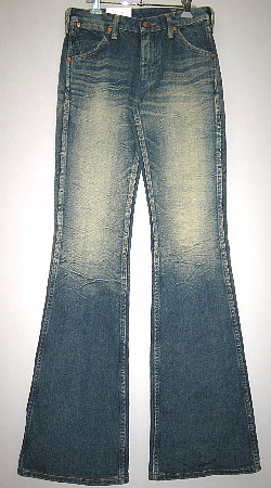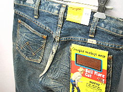 ラベルには「BellFlare」(ベルフレアー) という表記があり、ベルボトムというより ベルボトムとブーツカットの中間のようなシルエットです。 BISONなどに比べると 全体的に1サイズほど大きいようです。 *実寸はお問い合わせ下さい。 フロントはもちろんヒップや ヒザの裏やスソなど、細かい所にまで ユーズド感を出しており もう何年も穿いているかのような 色合いが大変カッコ良いです。 |