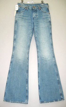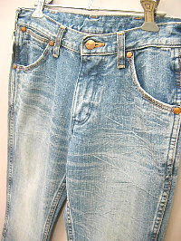 ラベルには「BellFlare」(ベルフレアー) という表記があり、ベルボトムというより ベルボトムとブーツカットの 中間のようなシルエットです。 BISONなどに比べると 1サイズほど大きいようです。 *実寸はお問い合わせ下さい。 フロントはもちろんヒップや ヒザの裏やスソなど、細かい所にまで ユーズド感を出しており もう何年も穿いているかのような 色合いが大変カッコ良いです。 |