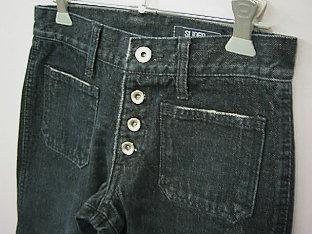 フロントボタンにはヴィンテージジーンズやレプリカジーンズなどに使われる ドーナツボタンを使用し、今までにない雰囲気を出しています。 現在当店にラインナップされているベルボトムでも ドーナツボタンを使用した物は「SLIDER」ブランドだけです。 |