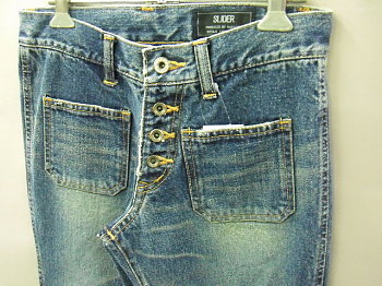 フロントボタンにはヴィンテージジーンズやレプリカジーンズなどに使われる ドーナツボタンを使用し、今までにない雰囲気を出しています。 現在当店にラインナップされているベルボトムでも ドーナツボタンを使用した物は「SLIDER」ブランドだけです。 |