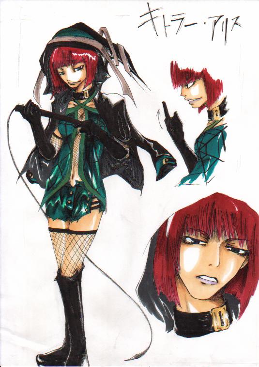 name キトラー・アリス age 127 sex 女 height 165(+3)←厚底 weight 56 capacity 魔術 一人称 私 二人称 貴方 女の場合、お嬢さん。男の場合、坊や という事が多い。あと名前をいうなら “〜ちゃん”などどこか見下すよりも子供扱い。 アルとベルのことも唯一、そのままアルちゃん ベルちゃん呼ばわりという肝の据わった方。 (礼儀知らずなだけか・・) しかし、怒った時やテンションが上がった時は 野郎・女(アマ)など普通に使う。乱れやすいというよりは 自分の感情に忠実なだけ。 筋力→2 体力→4 素早さ→8 魔力→8 知力→7 運→5 ◆捕らわれの身 クロウリー、リゲルと並ぶ三大魔術師の1人であるが魔人召喚を 行い、民に被害を加えた為、異端諮問に合った。しかし重要人物に 変わりが無かった為、処刑されずその能力を政府の為に使うことを 強制され、殆ど監視付きの監禁状態にあっていた。 ◆性格 耽美でナルシストでサディズム。快楽・刹那主義で 結構、安易だと思われがちだが、実は思慮深い。 悩みは肌に悪いから作らないようにしている。 だからか嫌いなものはない。しかし、それらは耐える事だと 悩みに俗するので消してしまうという方法である。 (あってはいけないという考えの元に) 好きな事は、楽しい事や興奮する事、踏む事。 好きなモノは、美しいモノ、詩、歌・・など。 歌については上機嫌だといつも歌い出すという癖まである ぐらい好きらしい。特に洋楽が多く、お気に入りは↓ what you have committed was sin and punshment that connot be erased prayer intites the midnight? where are there vessels children of wrath? never to repeat searching for unreachable happy crying out alon. we are the lamd. please my moon... keep one' eyes open we are can only die once. so please you are watching the life was performed. until ours hour has come. please think of me...♪ ◆戦闘 魔女は自分の武器をオリジナルに作り変えるもので、 キトラーの武器は鞭タイプの物。打った所にその魔術が 発生するようになっているが火や水など全て獣などに 具現化されて出てくる。高等魔術も使えるが、かなりの 精神力を使う事と、一瞬で終わってしまうという楽しみの なさから、余り使わず攻撃性の低い応用系の魔術 を良く使う。(上のような操作系など) 勿論、魔術だけでなく鞭は鞭としても使える。 |