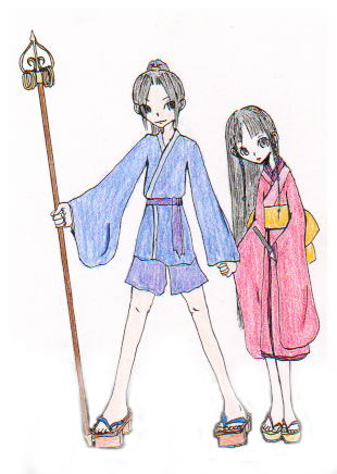 【左】 名前:ヨウ 性別:男性 年齢:? 身長:156p 体重:48kg 能力値:筋力・? 体力・? 素早さ・? 魔力・? 知性・? 運・? 【右】 名前:イン 性別:女性 年齢:? 身長:141p 体重:33kg 能力値:筋力・? 体力・? 素早さ・? 魔力・? 知性・? 運・? アルとベルに送りこまれた少年と少女の2人組。アル達同様、正体は謎。インの肌はすけるように白いが、ヨウはかなり健康的。ヨウの武器は錫杖、インの武器(?)は鉄笛。ヨウはやたらと素早い。ヨウの一人称は『わし』、インのは『私』。三人称はヨウが『うぬ』、インは『あなた』。インはヨウには敬語を使わない。ヨウの口調はやけに古臭い。相手を見下した話し方はしないが、だからと言ってへりくだった話し方もしない。 |