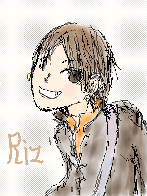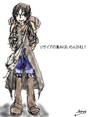 名前:リズ 性別:? 年齢:少なくとも見た目は13、4歳程度 身長:150p程度 体重:身長に見合った重さ 一人称:ボク(僕ではない。片仮名でボク。) 他人:キミ アナタ等 複数:キミら アナタ達 性格: 明るい。よくはしゃぐ。はっきり言うと、騒がしくて、うるさい。人見知りしない。色々な事を知っている。 容姿: 茶色の髪と瞳。やや吊り目気味。華奢?小柄。両耳に格つずつピアス。絵を参照。下は半ズボンに、ブーツ。上に羽織っている茶色いのは、ロングコート。肩からかけているのは、大きいショルダーバッグ。本当は、背中にでかいリュックを背負っている。 その他: 素性などが一切謎の変な子供。 取りあえず、かなりの魔法の使い手…らしい。常に持ち歩いているカバンからは、色々な物が出てくる。たまに、有り得ないようなサイズのものを取り出して、周囲を驚かすことも。『四次元バッグ』だとも疑われている。 商人として様々な場所を放浪しているらしい。 あくまで自称だが、その商才は素晴らしいものがある。品揃えも恐ろしいほど豊富。 走るのは速い。と言うか、逃げるのが早い。体力も結構ある。 謳い文句は「リザイアの恵みはいらんかね?」。初めて会った人には誰にでも言う。例えそれが魔物だろうが間族だろうが果てはヤクザだろうが、取りあえず、言う。 |